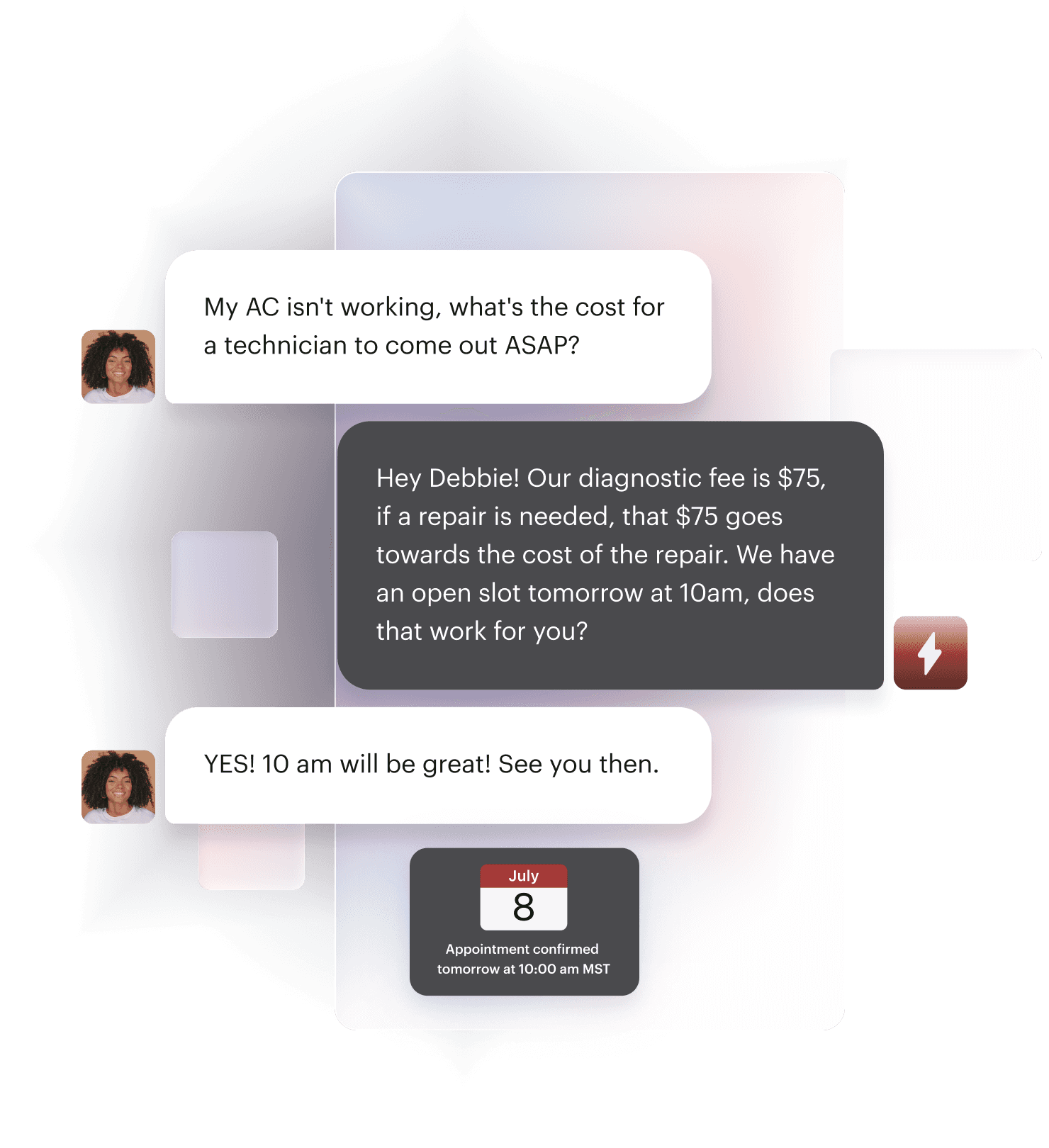 Schedules appointments directly onto your calendar or through ServiceTitan or Housecall Pro—without human oversight.