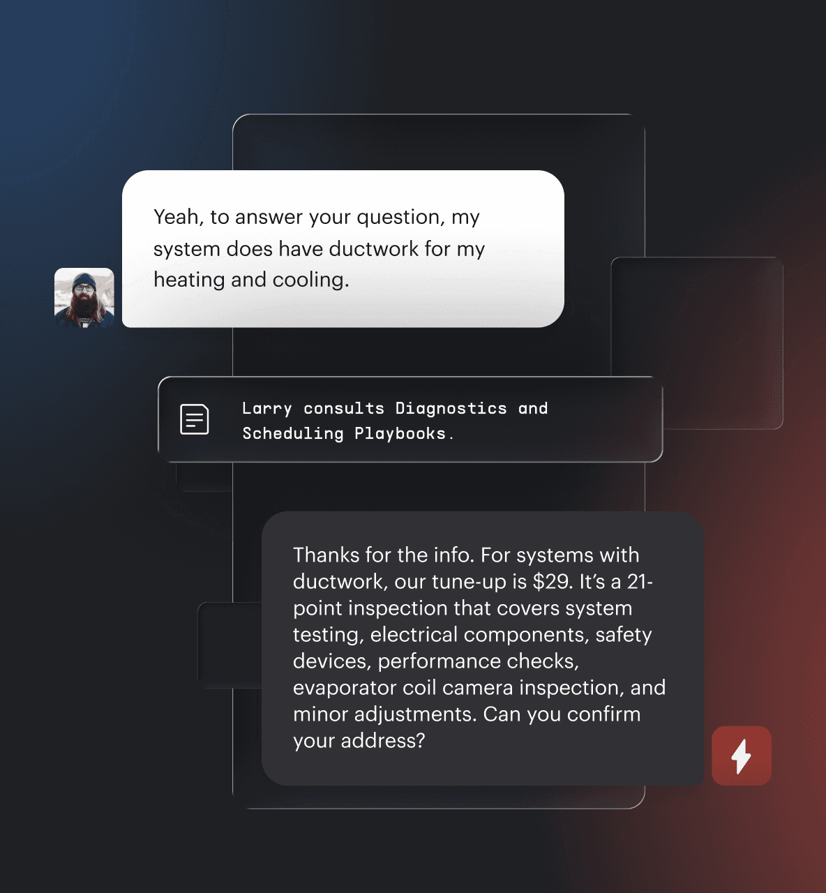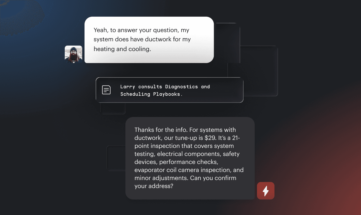 Larry follows your business’s playbooks for talking with leads and customers, leaning into whatever sales approach you prefer—a hard sale, consultative language, and beyond, sensing the right tone given the context.