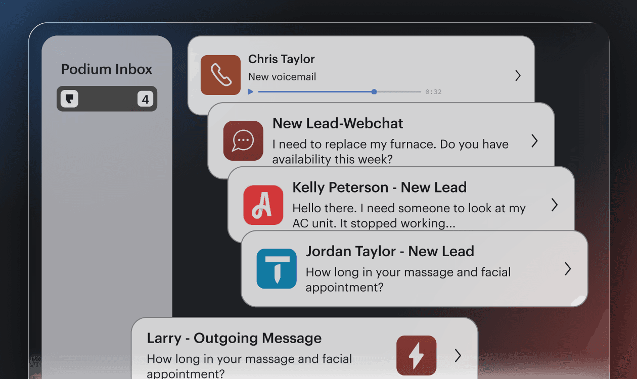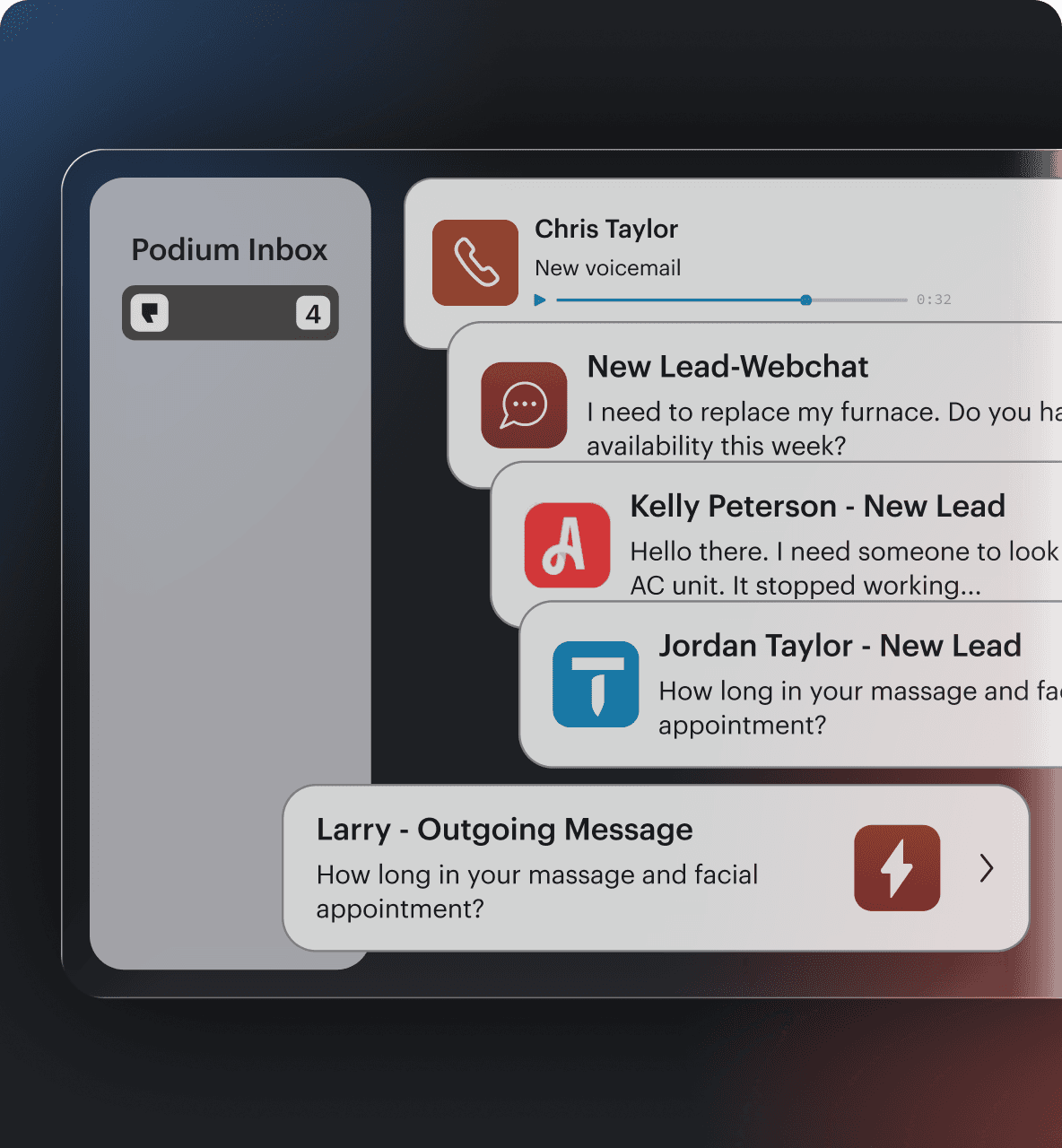 Podium centralizes every lead—from third-party sources to email—into one inbox. Larry responds instantly, updates contact records, and routes conversations to the right person, ensuring no prospect is missed.