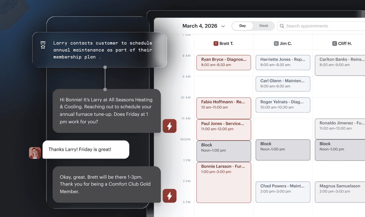 Larry re-engages customers with personalized messaging for appointment follow-ups, duct cleaning, maintenance, inspections, etc.